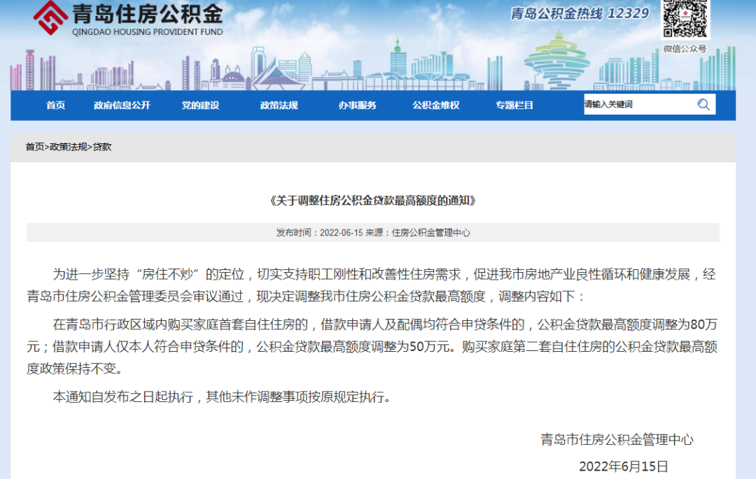 6月15日,青島市住房公積金管理中心發布,調整首套住房公積金貸款最高額度。